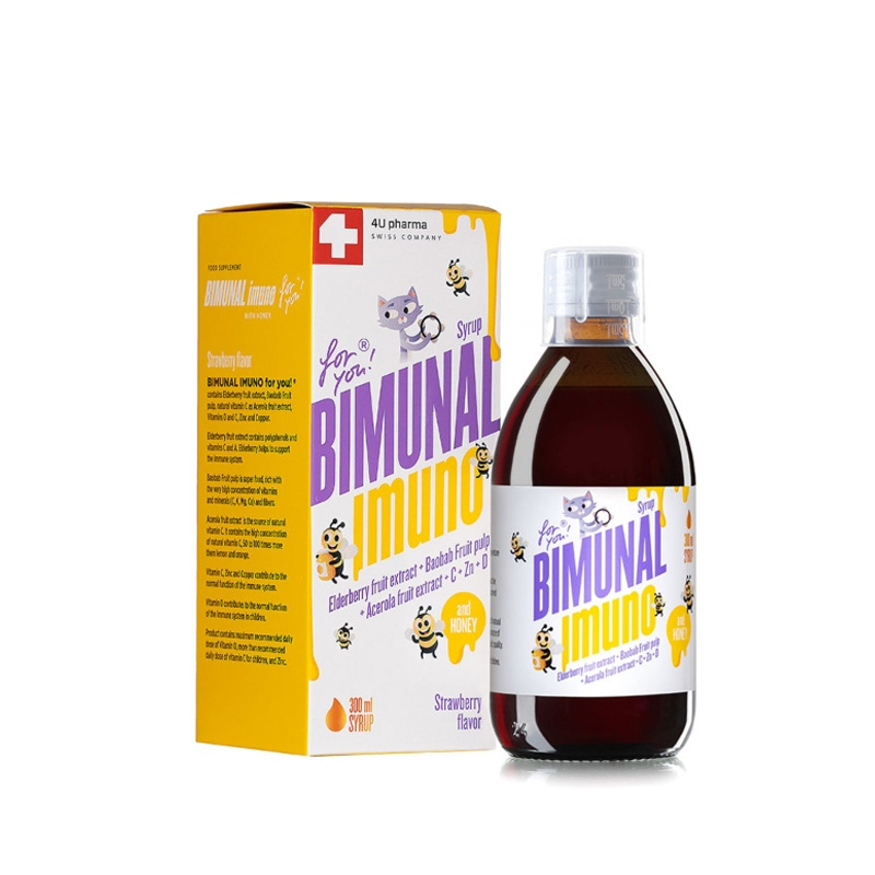 BIMUNAL SIRUP 300ML je proizvod brenda 4U Pharma, koji se koristi za podršku imunološkom sistemu. Ovaj sirup sadrži pažljivo odabrane sastojke koji doprinose jačanju prirodne otpornosti organizma. BIMUNAL SIRUP je posebno formulisan kako bi pomogao u očuvanju zdravlja, posebno u periodima kada je organizam izložen različitim stresorima, kao što su sezonske prehlade ili virusi. Njegova prijatna aroma i ukus čine ga pogodnim za decu i odrasle, a lako se može uključiti u svakodnevnu ishranu.
