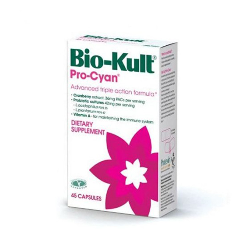 BIO-KULT PRO-CYAN KAPSULE A/45 su dodatak ishrani koji sadrži jedinstvenu kombinaciju probiotika i prirodnih sastojaka. Ovaj proizvod je razvijen sa ciljem da podrži zdravlje creva i doprinese opštem blagostanju organizma. Svaka kapsula sadrži pažljivo odabrane sojeve probiotika, kao i ekstrakt brusnice, koji je poznat po svojim svojstvima koja pomažu u održavanju zdravlja mokraćnog sistema. BIO-KULT PRO-CYAN je pogodan za odrasle i decu, a može se koristiti kao deo svakodnevne ishrane za poboljšanje probavnog zdravlja.