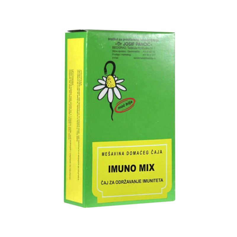 Čaj broj 100 Imuno Mix, brenda Institut Josif Pančić, predstavlja prirodni biljni preparat koji je osmišljen da podrži imunološki sistem i poboljša opšte zdravstveno stanje organizma. Ovaj čaj sadrži pažljivo odabrane biljne sastojke koji su poznati po svojim blagotvornim svojstvima. Njegova formulacija je rezultat dugogodišnjeg istraživanja i tradicije korišćenja lekovitog bilja, a cilj mu je da pruži podršku organizmu u borbi protiv prehlada, gripa i drugih infekcija. Čaj je pogodan za sve uzraste i može se koristiti kao dodatak zdravoj ishrani.