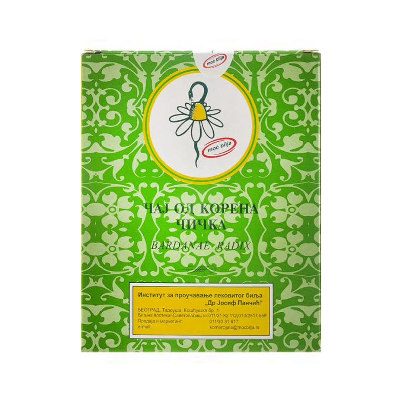 Čaj od korena čička, brenda Institut Josif Pančić, predstavlja prirodni biljni preparat koji se koristi u tradicionalnoj medicini. Čičak (Arctium lappa) je poznata biljka koja se koristi zbog svojih lekovitih svojstava, a koren čička je posebno cenjen zbog bogatstva hranljivih sastojaka. Ovaj čaj se priprema od sušenog korena čička i može se koristiti kao dodatak ishrani ili kao prirodni lek za različite zdravstvene tegobe. Čaj od korena čička je poznat po svojim detoksikacionim svojstvima, a takođe se koristi za podršku probavnom sistemu i jačanje imunološkog sistema.