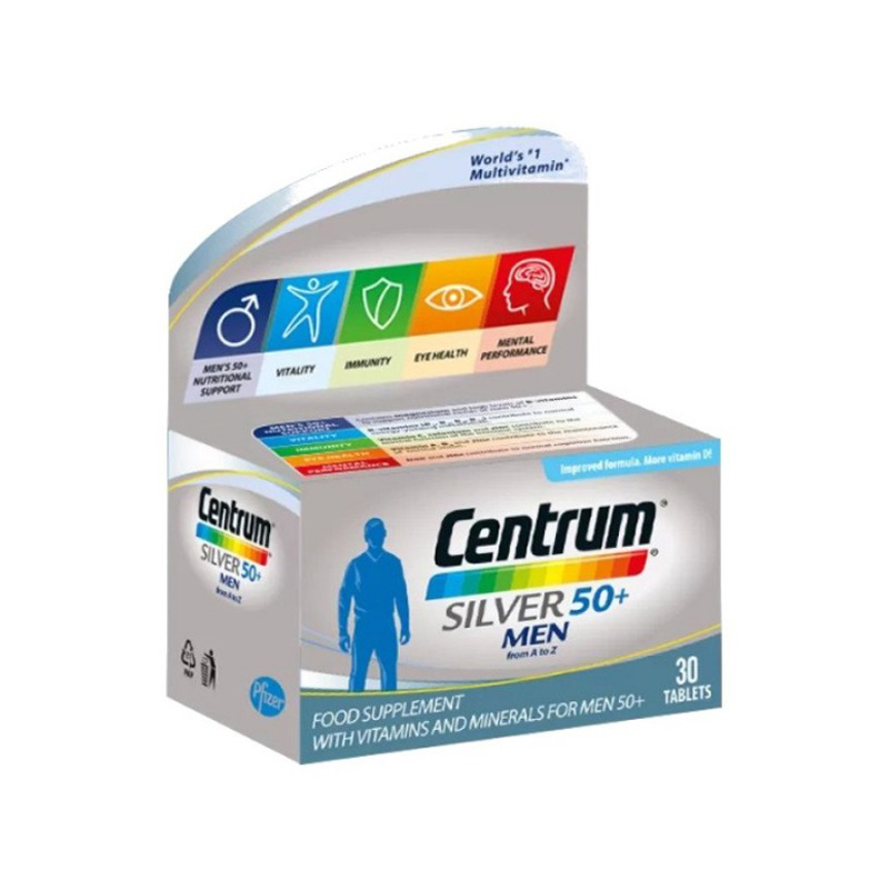 CENTRUM SILVER MEN A30 je multivitaminski i mineralni dodatak ishrani posebno formulisan za muškarce starije od 50 godina. Ovaj proizvod brenda Centrum sadrži pažljivo odabrane vitamine i minerale koji pomažu u održavanju opšteg zdravlja i vitalnosti. Centrum Silver Men A30 je dizajniran da podrži imunološki sistem, poboljša energiju i doprinese zdravlju srca i kostiju. Njegova jedinstvena formula obezbeđuje potrebne hranljive materije koje su često nedovoljne u ishrani starijih muškaraca, čime se pomaže u očuvanju zdravlja i prevenciji raznih bolesti.