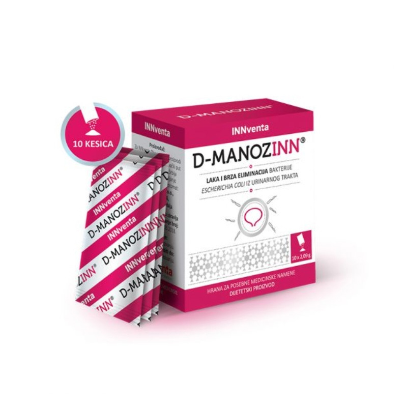 D-MANOZINN 10X2,09Gi je prehrambeni dodatak koji sadrži D-manozu, prirodni šećer koji se koristi za podršku zdravlju mokraćnog sistema. Ovaj proizvod brenda Innventa je formulisan kako bi pomogao u održavanju optimalne funkcije bešike i bubrega, kao i u prevenciji urinarnih infekcija. D-manoza se prirodno nalazi u voću kao što su brusnice i jabuke, a njen glavni mehanizam delovanja je vezivanje za bakterije koje uzrokuju infekcije, čime se sprečava njihovo vezivanje za zidove mokraćnog sistema.