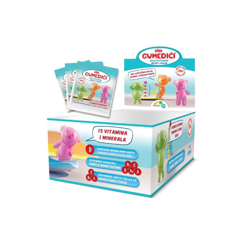 Gumedići Bombone Multivitamin A/3 su prehrambeni suplement brenda Esensa, koji kombinuje ukusne gumene bombone sa bogatim sadržajem vitamina i minerala. Ove bombone su posebno dizajnirane da pruže podršku imunološkom sistemu, poboljšaju opšte zdravlje i doprinesu vitalnosti organizma. S obzirom na to da su napravljene od prirodnih sastojaka, Gumedići su idealni za sve uzraste, a posebno za decu koja često odbijaju da uzimaju vitamine u klasičnom obliku. Njihova prijatna aroma i slatkast ukus čine ih savršenim dodatkom svakodnevnoj ishrani.