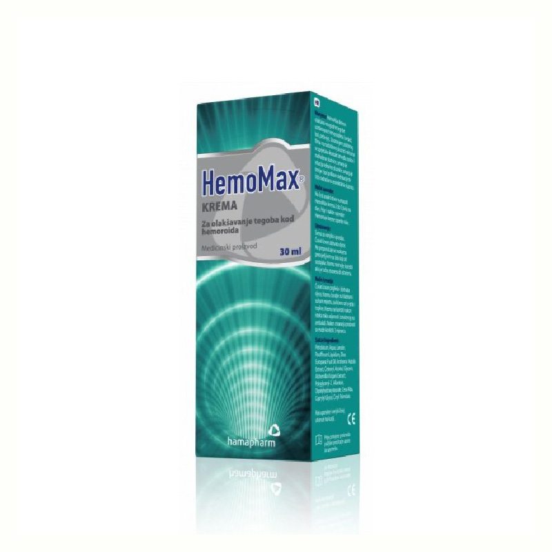 HEMOMAX KREMA ZA HEMOROIDE 30ML je specijalizovani proizvod brenda Hemapharm, namenjen za efikasno ublažavanje simptoma hemoroida. Ova krema sadrži aktivne sastojke koji pomažu u smanjenju upale, svraba i nelagodnosti u analnom području. HEMOMAX je formulisan tako da pruža brzo olakšanje i doprinosi bržem oporavku tkiva, čime se poboljšava kvalitet života osoba koje pate od ovog problema. Krema je pogodna za svakodnevnu upotrebu i može se koristiti kao deo sveobuhvatnog pristupa lečenju hemoroida.