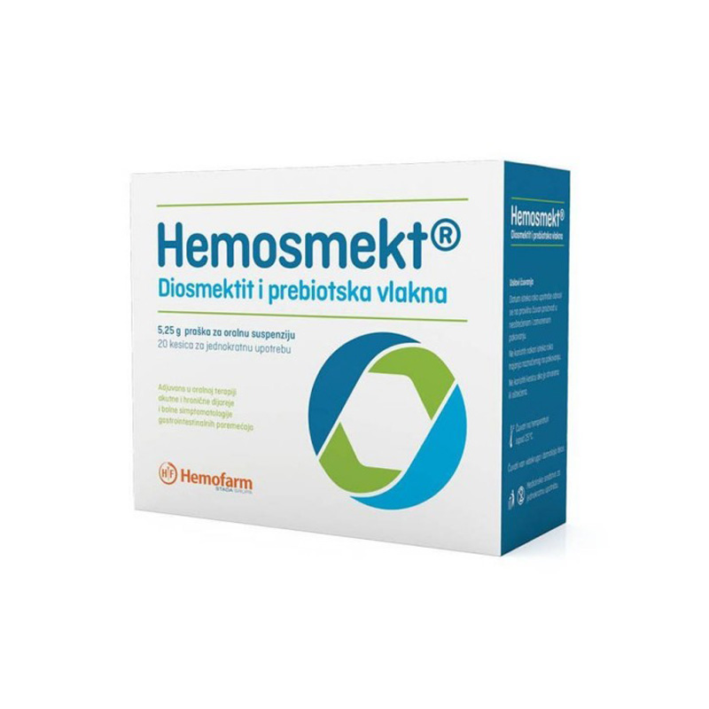 HEMOSMEKT 3G+2G PRAŠAK ZA ORALNU SUSPENZIJU A/20 je medicinski proizvod koji se koristi za lečenje proliva i drugih gastrointestinalnih poremećaja. Ovaj proizvod sadrži aktivne sastojke koji pomažu u obnavljanju ravnoteže elektrolita i tečnosti u organizmu, što je posebno važno kod dehidratacije izazvane prolivom. HEMOSMEKT je formulisan kao prašak koji se lako rastvara u vodi, čime se omogućava jednostavna primena i brza apsorpcija u organizmu. Proizvod je namenjen za odrasle i decu, a dolazi u pakovanju od 20 kesica, što ga čini praktičnim za upotrebu kod kuće ili na putu.