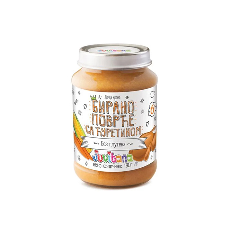 Juvitana kašica Birano povrće/ćuretina je visokokvalitetan proizvod namenjen ishrani beba i malih dece. Ova kašica sadrži pažljivo odabrane sastojke, uključujući povrće i meso ćuretine, koji su bogati hranljivim materijama potrebnim za pravilan rast i razvoj. Juvitana se ističe svojom prirodnom formulom, bez dodatka konzervansa i veštačkih boja, što je čini sigurnim izborom za roditelje koji žele da obezbede zdravu ishranu svojoj deci. Pakovanje od 190g je praktično i lako za upotrebu, idealno za obroke kod kuće ili u pokretu.