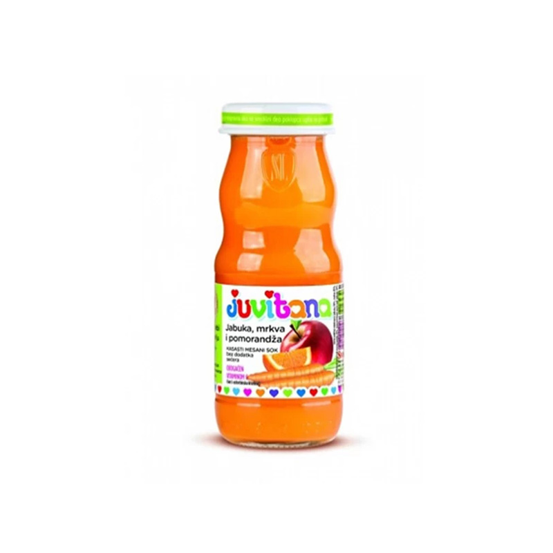 Juvitana sok jabuka/šargarepa/narandža je prirodni voćni sok koji kombinuje hranljive sastojke jabuka, šargarepe i narandže. Ovaj sok je bogat vitaminima, mineralima i antioksidansima, što ga čini odličnim izborom za jačanje imuniteta i poboljšanje opšteg zdravlja. Jabuka je poznata po svom sadržaju vlakana i vitamina C, šargarepa je bogata beta-karotenom, dok narandža doprinosi unosu vitamina C i flavonoida. Ova kombinacija čini Juvitana sok idealnim za svakodnevnu konzumaciju, pružajući osveženje i energiju tokom dana.