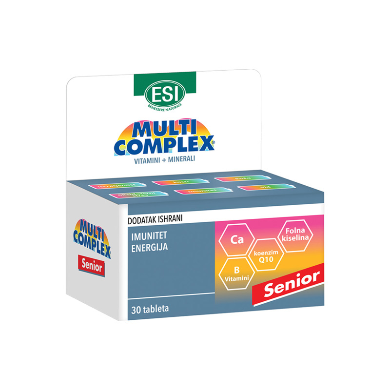 MULTICOMPLEX SENIOR je dodatak ishrani koji je posebno formulisan za starije osobe. Ovaj proizvod brenda Esi sadrži pažljivo odabrane vitamine, minerale i druge hranljive sastojke koji su neophodni za očuvanje zdravlja i vitalnosti u trećem životnom dobu. MULTICOMPLEX SENIOR pomaže u jačanju imunološkog sistema, poboljšanju mentalne funkcije i održavanju optimalnog nivoa energije. Njegova jedinstvena formula doprinosi opštem blagostanju i kvalitetu života starijih osoba, pružajući im potrebnu podršku u svakodnevnim aktivnostima.