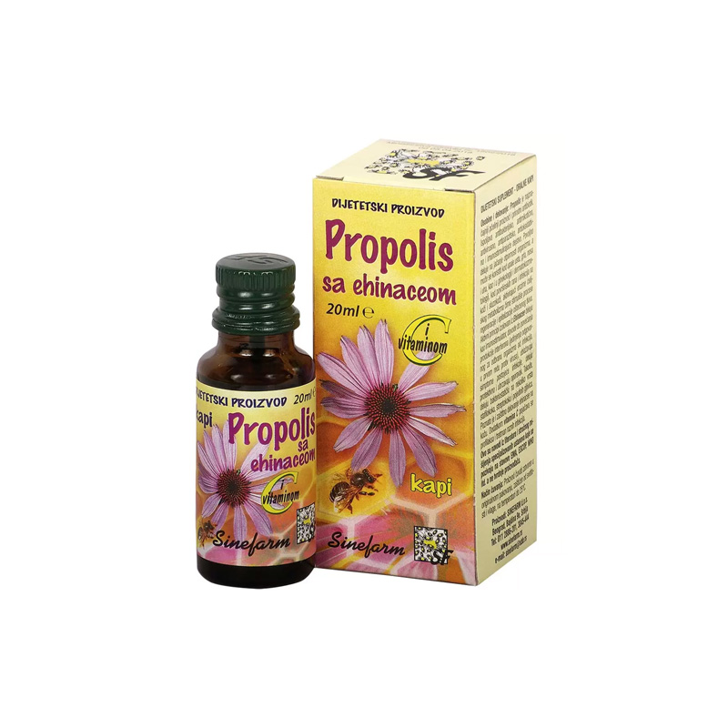 PROPOLIS KAPI SA EHINACEOM brenda Sinefarm predstavljaju prirodni dodatak ishrani koji kombinuje blagodeti propolisa i biljke ehinacee. Propolis, poznat po svojim antibakterijskim, antivirusnim i antiinflamatornim svojstvima, pomaže u jačanju imunološkog sistema i zaštiti organizma od raznih infekcija. Ehinacea, s druge strane, je popularna biljka koja se često koristi za prevenciju i lečenje prehlada i gripa, kao i za poboljšanje opšteg zdravlja. Ova kombinacija čini Propolis kapi sa Ehinaceom efikasnim rešenjem za podršku imunološkom sistemu, posebno u sezoni prehlada i gripa.