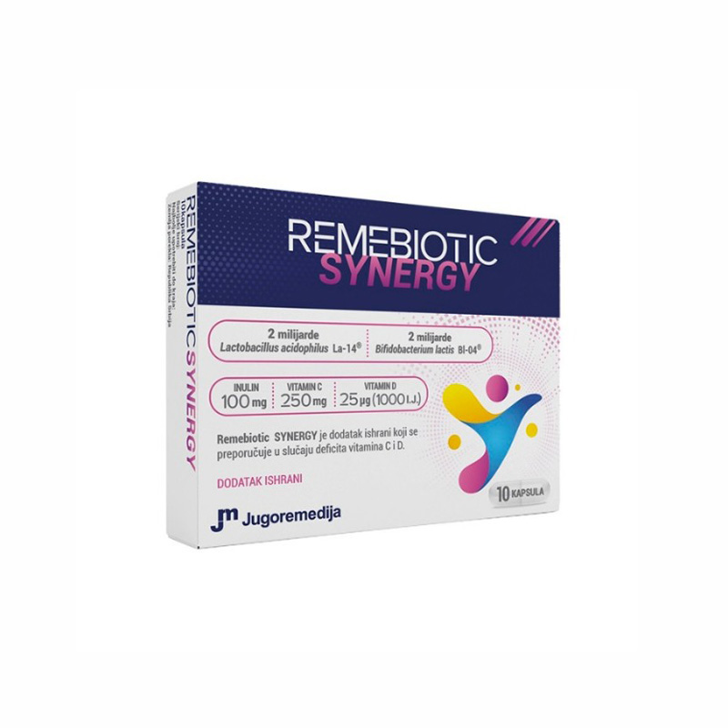 REMEBIOTIC SYNERGY KAPSULE A/10 je probiotik brenda Jugoremedija, koji je razvijen sa ciljem da podrži zdravlje crevne flore i poboljša opšte zdravstveno stanje organizma. Ove kapsule sadrže pažljivo odabrane sojeve probiotskih bakterija koji su klinički ispitani i dokazano delotvorni. Proizvod je formulisan tako da obezbedi optimalnu ravnotežu mikroflore u crevima, što može doprineti boljoj probavi, jačanju imunološkog sistema i smanjenju simptoma povezanih sa disbiozom.