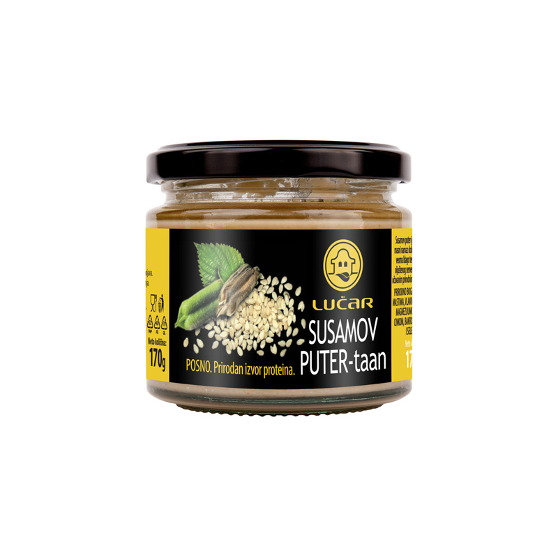 SUSAMOV PUTER 170g - Lučar je prirodni proizvod koji se dobija mlevenjem semena susama. Ovaj puter je bogat hranljivim sastojcima, uključujući proteine, zdrave masti, vitamine i minerale. Susamov puter je poznat po svom karakterističnom ukusu i kremastoj teksturi, što ga čini savršenim dodatkom raznim jelima. Osim što je ukusan, susamov puter je i izvor mnogih zdravstvenih benefita, uključujući podršku zdravlju srca, poboljšanje probave i jačanje imunološkog sistema.