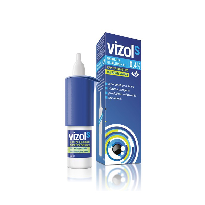 VIZOL S KAPI ZA OČI 0,4% je medicinski proizvod koji se koristi za vlaženje i podmazivanje suvih i iritiranih očiju. Ove kapi su posebno formulirane da pruže olakšanje od simptoma suhog oka, koji mogu nastati usled različitih faktora kao što su dugotrajno korišćenje računara, izloženost vetru, dimu ili suvom vazduhu. VIZOL S sadrži natrijum hijaluronat, koji je poznat po svojim hidratantnim svojstvima i sposobnosti da zadrži vlagu, čime se poboljšava udobnost i zdravlje očiju. Proizvod je bez konzervansa, što ga čini pogodnim za osobe koje nose kontaktna sočiva.